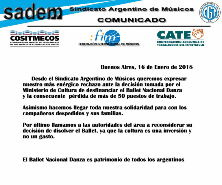 Desde el Sindicato Argentino de Músicos queremos expresar nuestro más enérgico rechazo ante la decisión tomada por el Ministerio de Cultura de desfinanciar el Ballet Nacional de Danza y la consecuente pérdida de más de 50 puestos de trabajo.