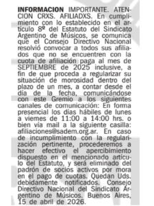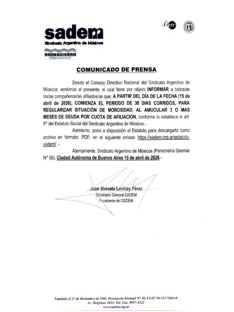 Desde el Consejo Directivo Nacional del Sindicato Argentino de Músicos, informamos a todos nuestros afiliados y afiliadas que se abre un período especial para ponerse al día.